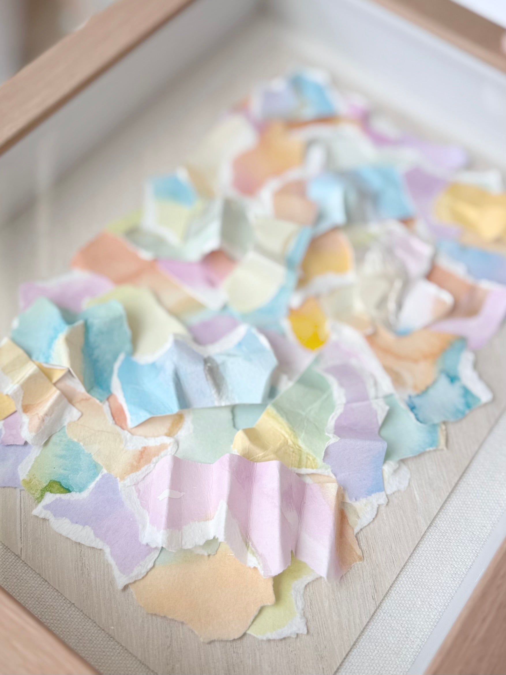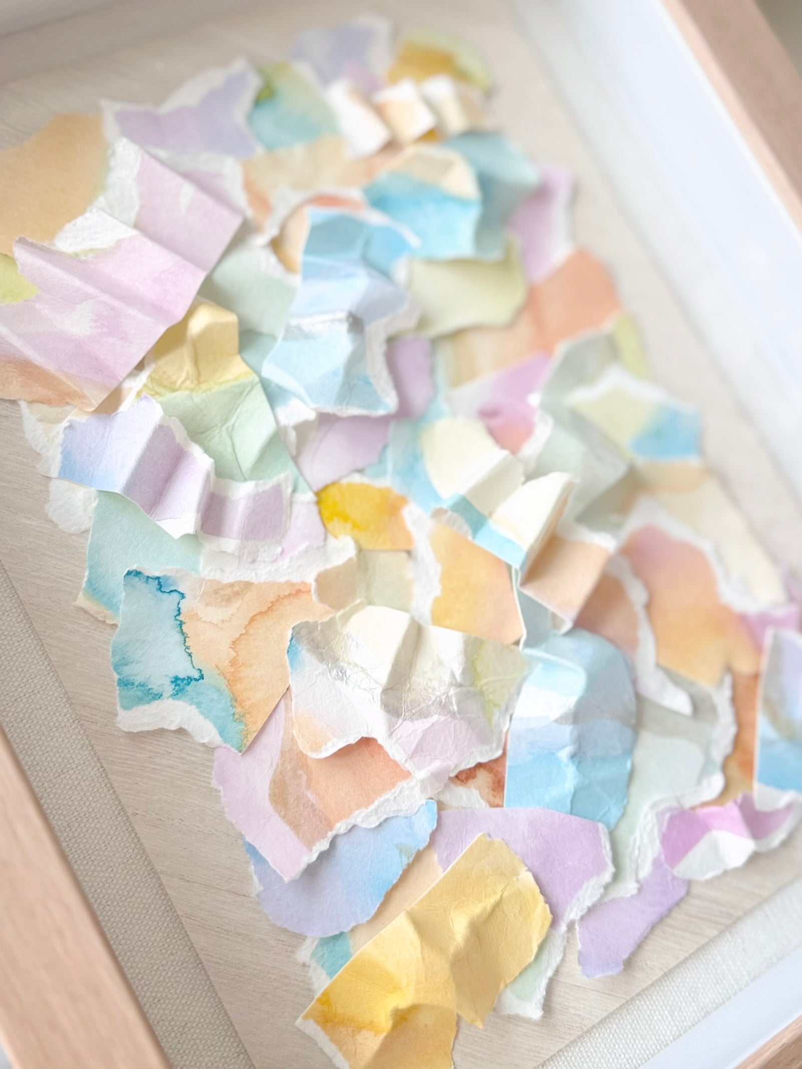 Bring home imaginative, alluring mixed media collages meticulously crafted by Liz! These unique works of art are crafted from original acrylic ink paintings, creatively and intentionally ripped, folded and woven into the work to evoke emotion of growth and new beginnings.