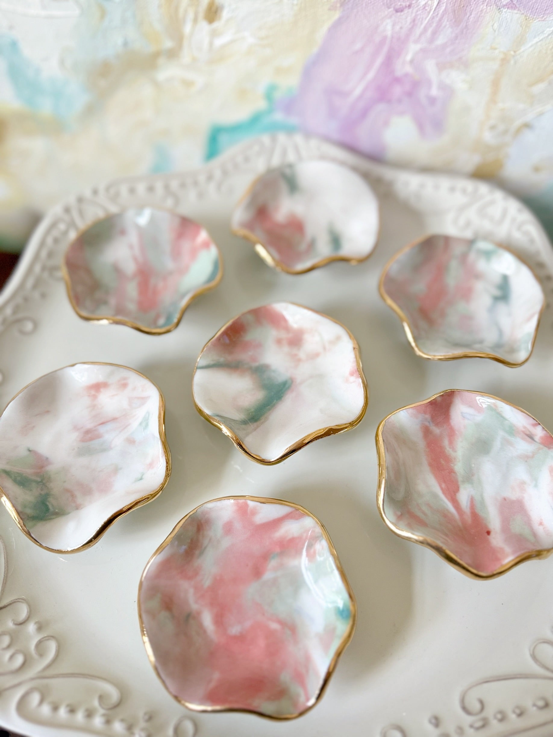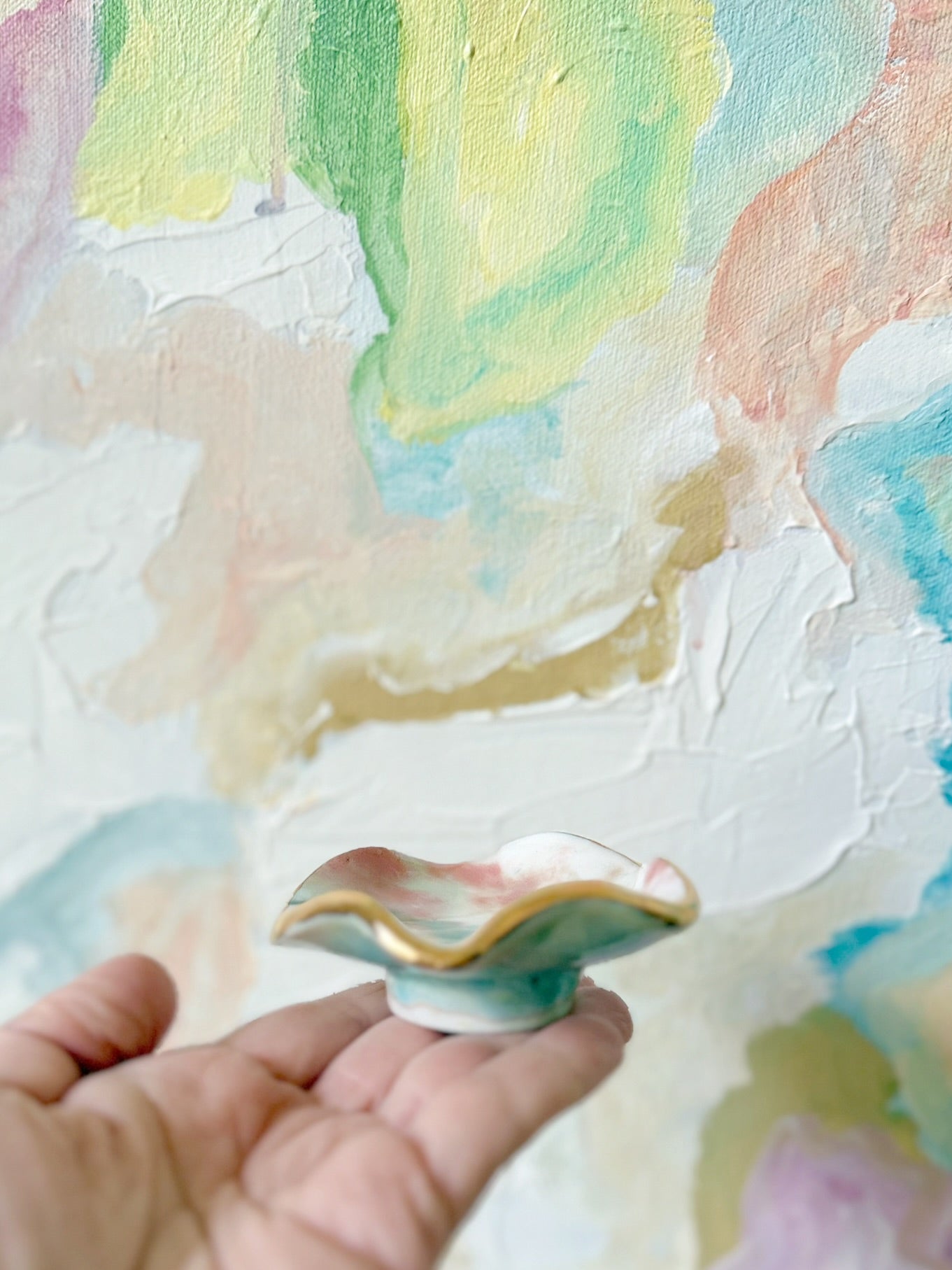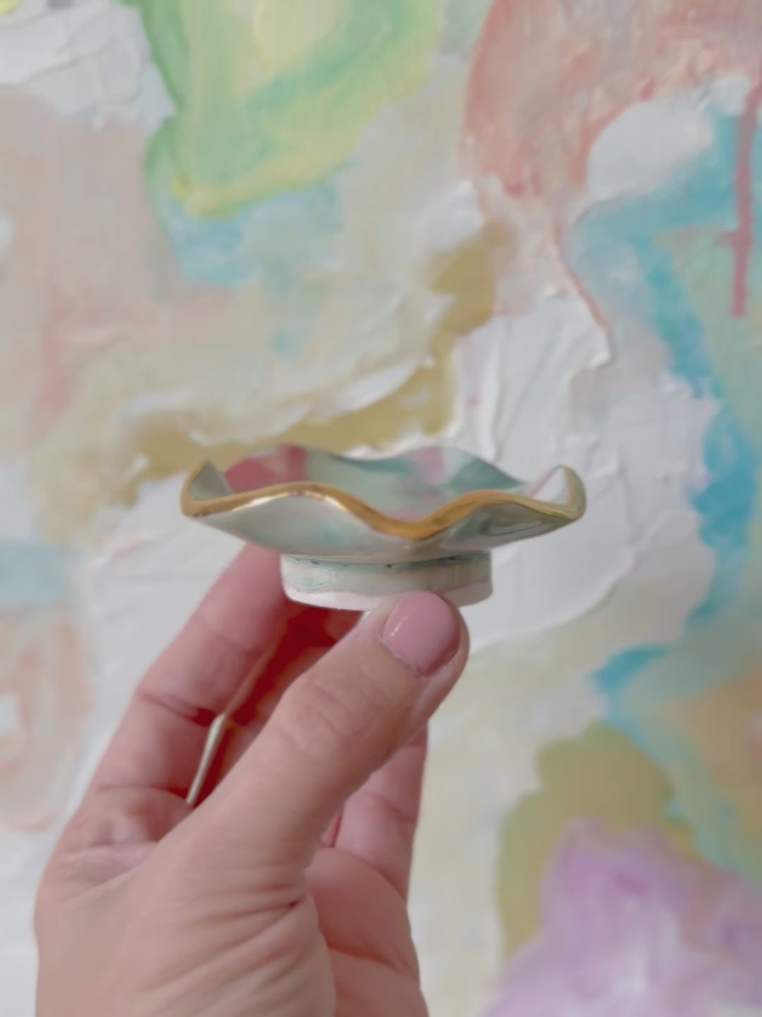 This whimsical handmade porcelain wavy trinket dishes feature Gleaming Gold accents! What a joyful way to elevate your daily routine! The beautiful 22K yellow gold lusters exude elegance! It’s sure to brighten your day and bring joy to your favorite jewelry pieces!
