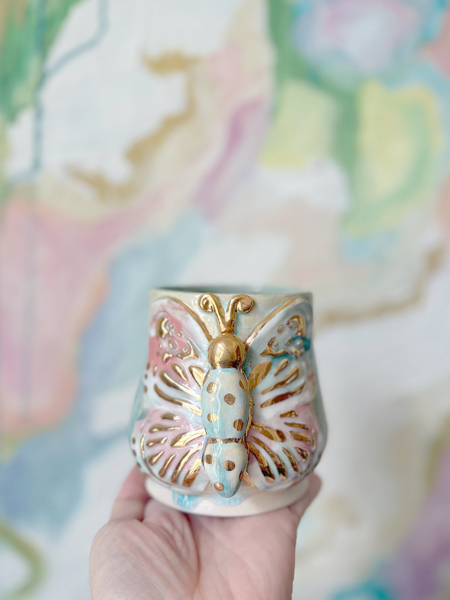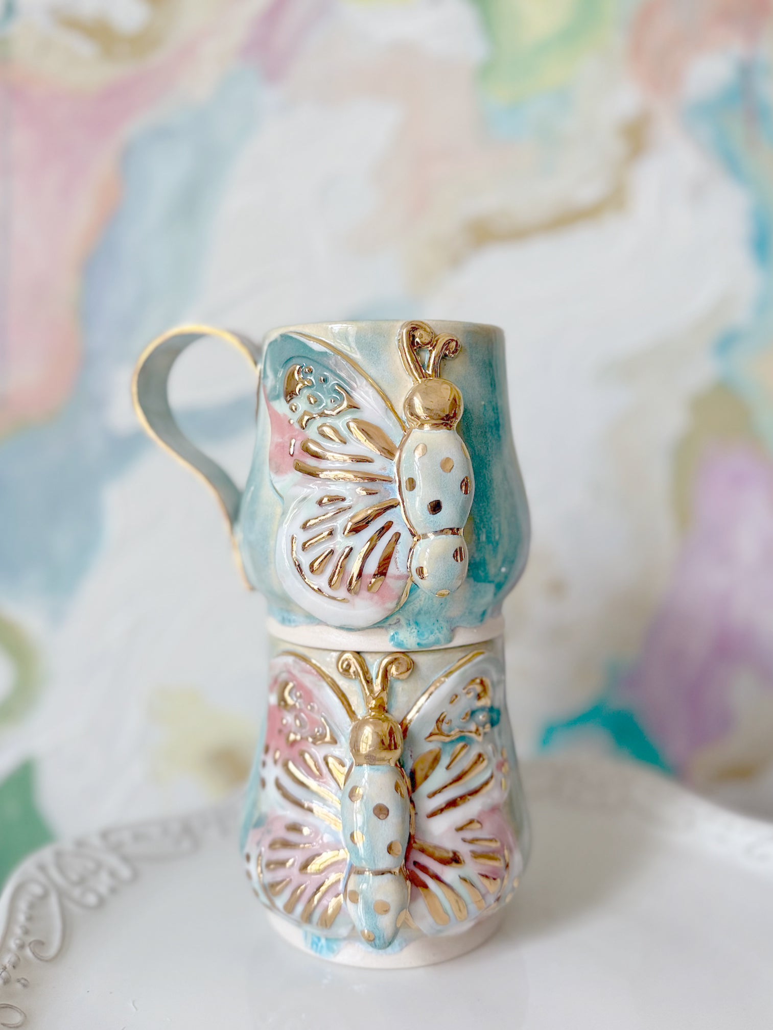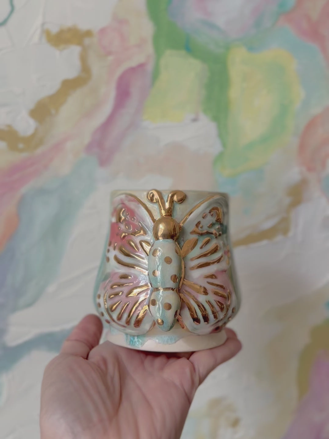 This whimsical handmade porcelain tumbler features a Butterfly with Gleaming Gold accents and a unique melonaid glaze! What a joyful way to elevate your daily routine! The beautiful 22K yellow gold lusters exude elegance! It’s sure to brighten your day and bring joy to your favorite sips!