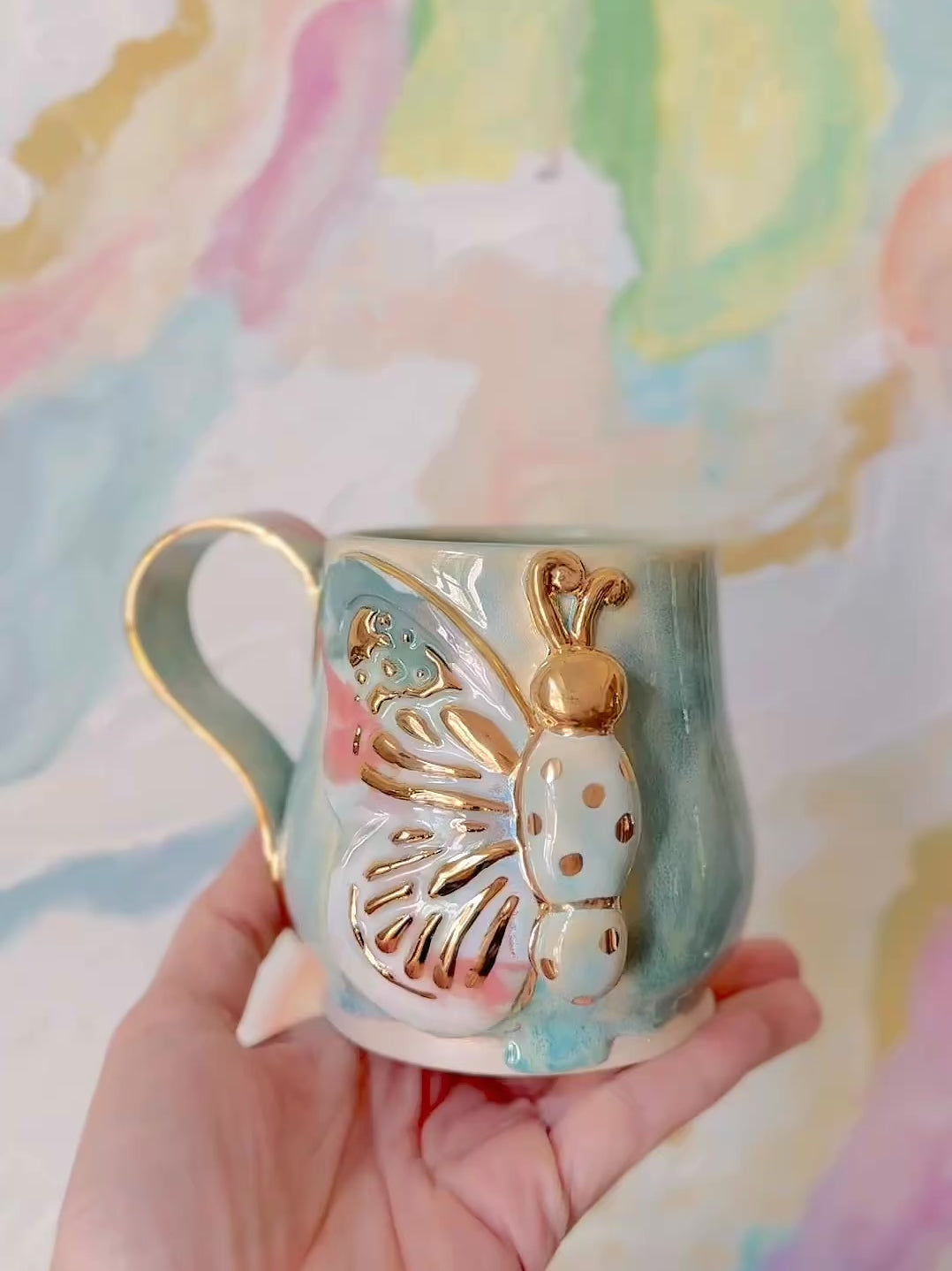 This whimsical handmade porcelain mug features a Butterfly with Gleaming Gold accents and a unique melonaid glaze! What a joyful way to elevate your daily routine! The beautiful 22K yellow gold lusters exude elegance! It’s sure to brighten your day and bring joy to your favorite sips!