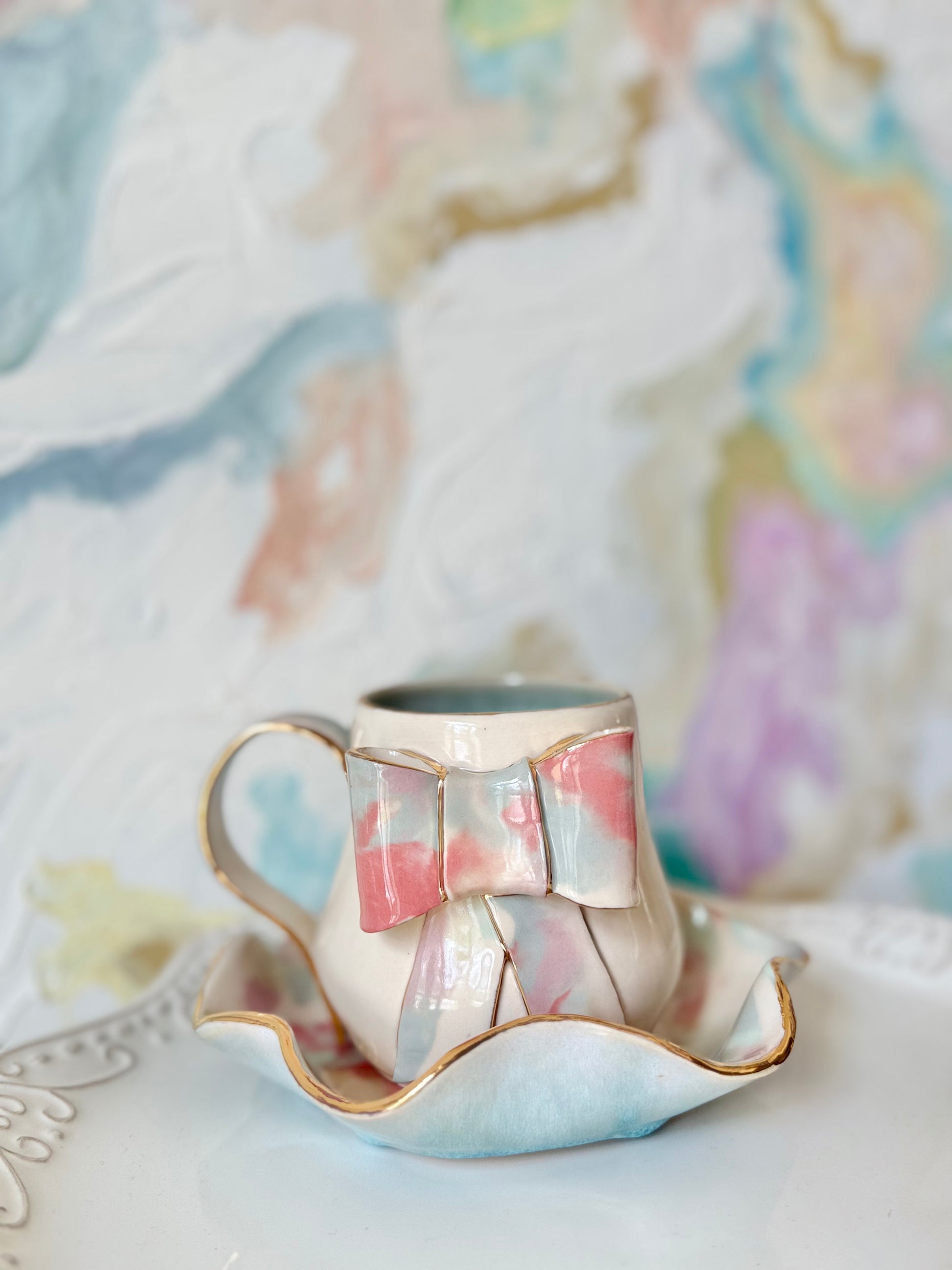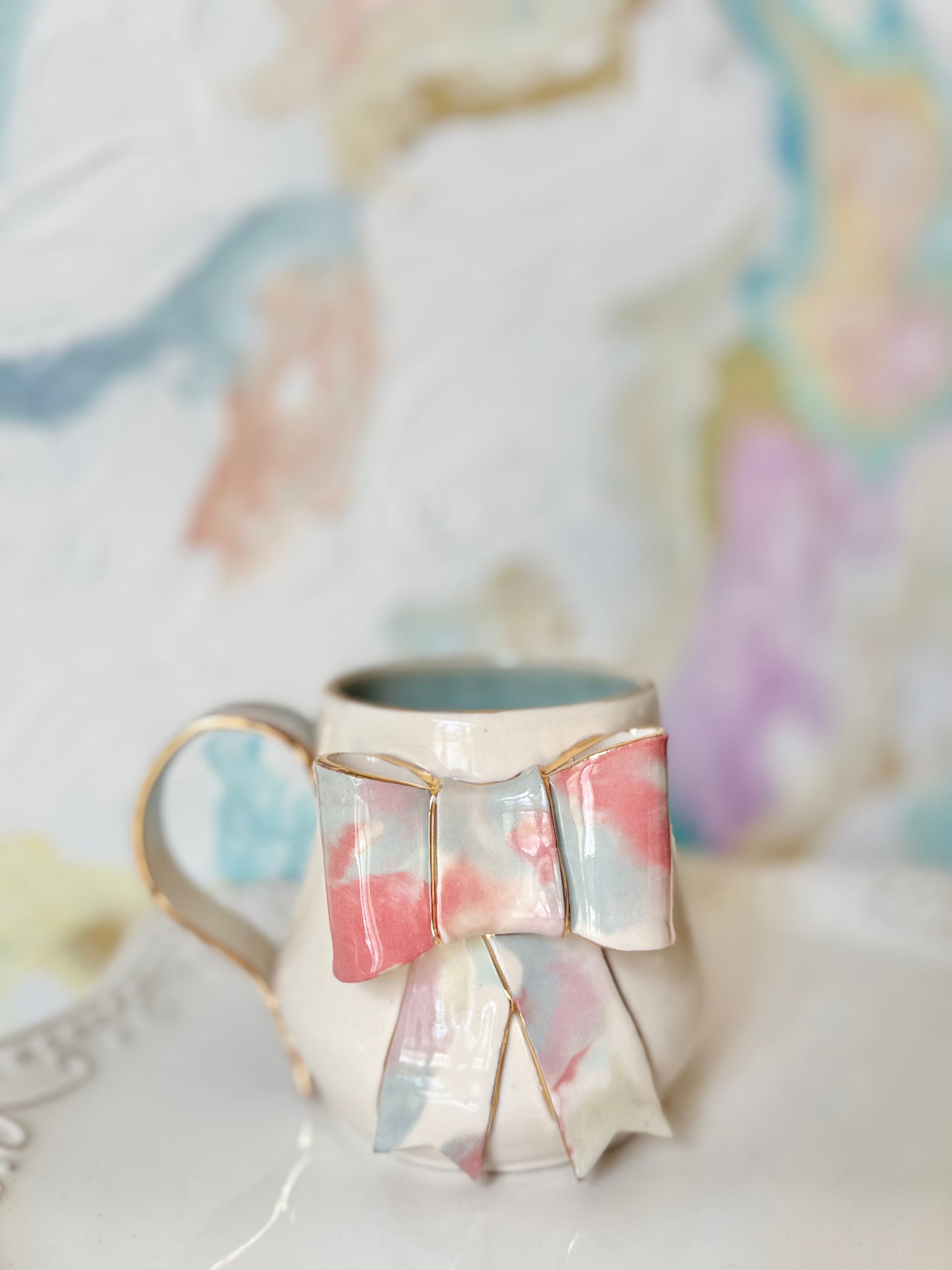 This whimsical handmade porcelain mug features a delicate bow marbled of colored porcelain with Gleaming Gold accents and a unique melon glaze! What a joyful way to elevate your daily routine! The beautiful 22K yellow gold lusters exude elegance! It’s sure to brighten your day and bring joy to your favorite sips!