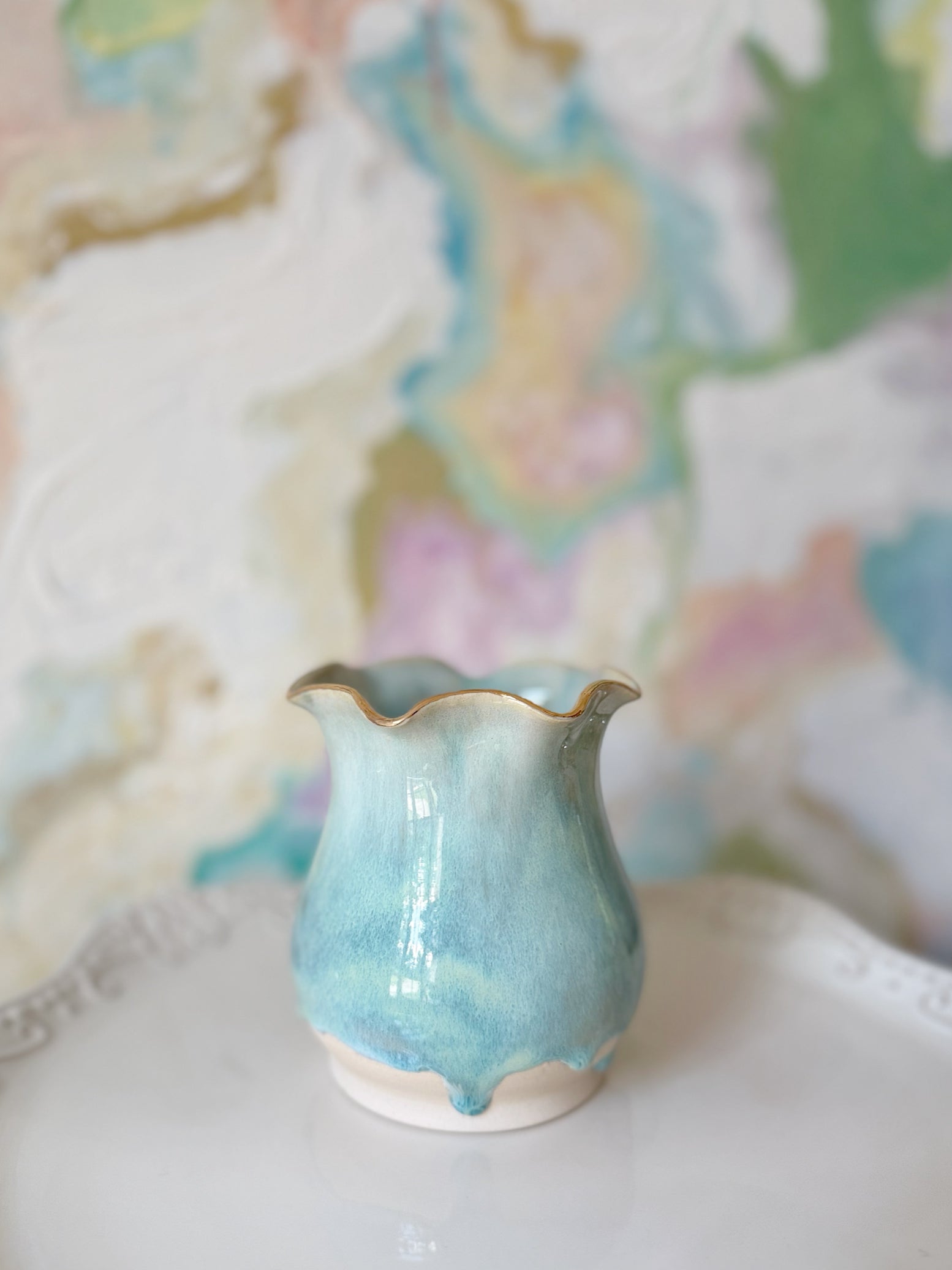 This whimsical handmade porcelain vase features a delicate ruffle rim with Gleaming Gold accents. What a joyful way to elevate your decor! The beautiful 22K yellow gold lusters exude elegance! It’s sure to brighten your day and bring joy to your day!