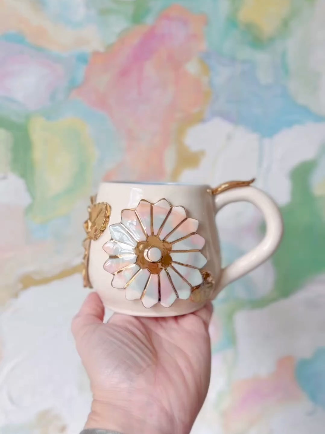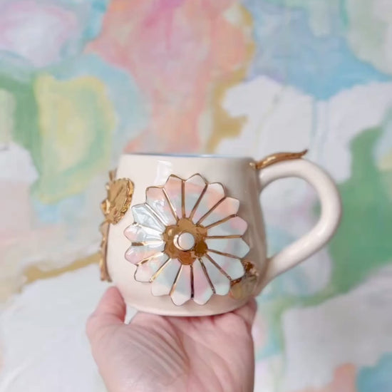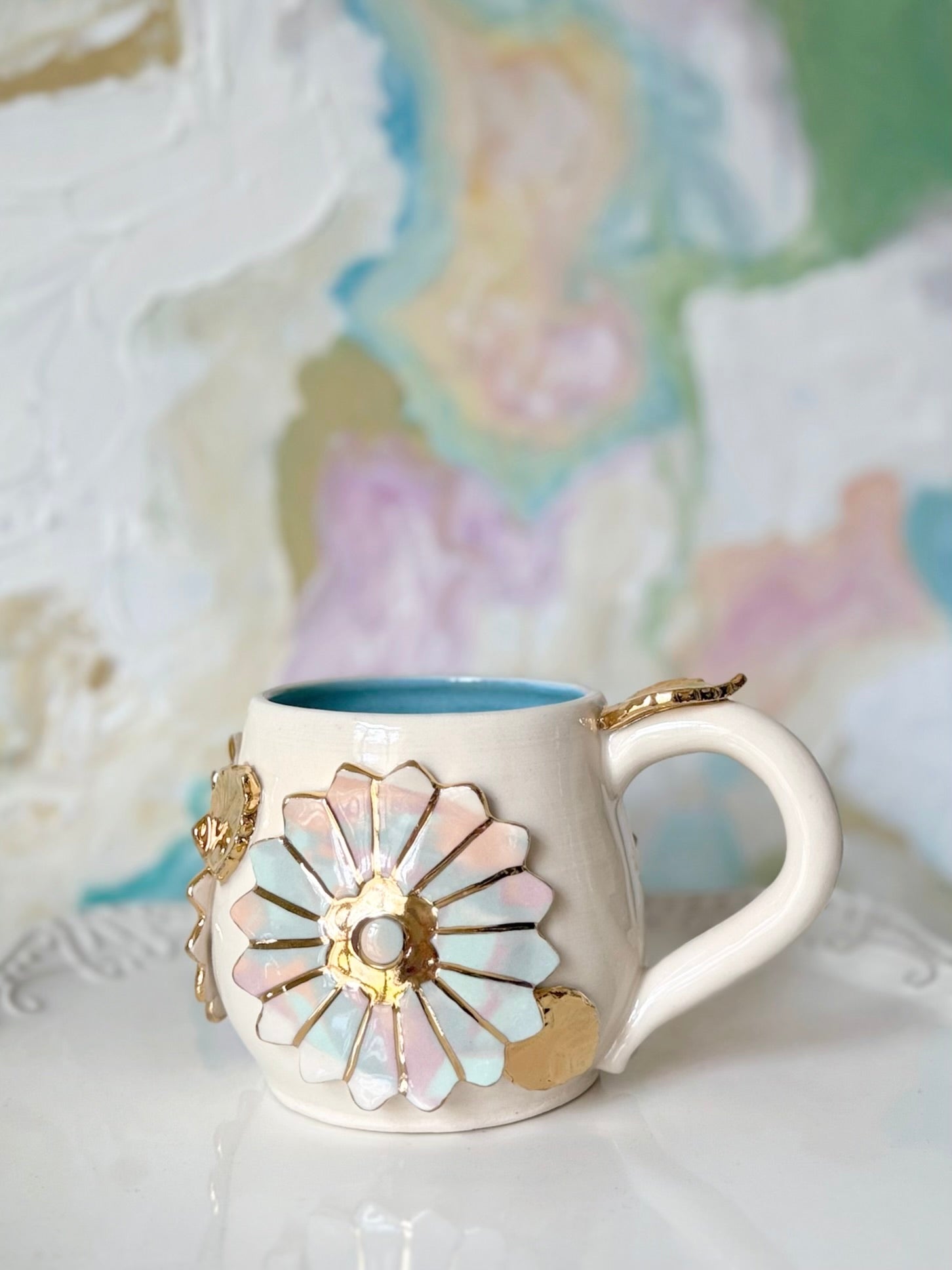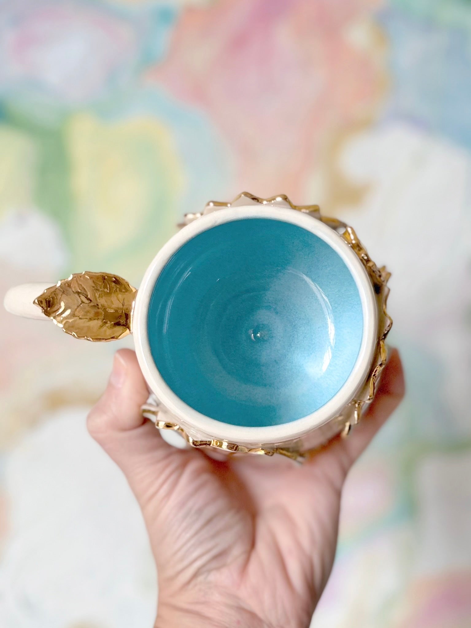 This whimsical handmade porcelain mug features delicate marbled flowers of colored porcelain with Gleaming Gold accents and a turquoise glaze! What a joyful way to elevate your daily routine! The beautiful 22K yellow gold lusters exude elegance! It’s sure to brighten your day and bring joy to your favorite sips!