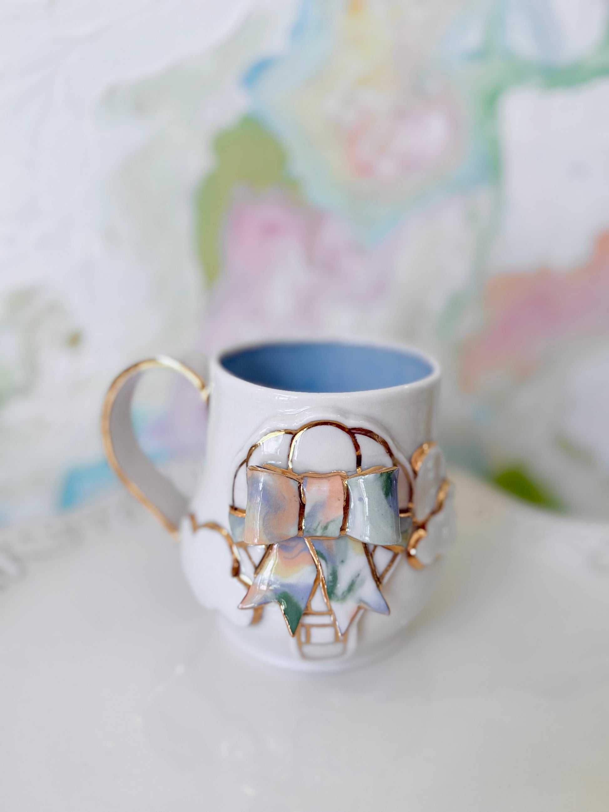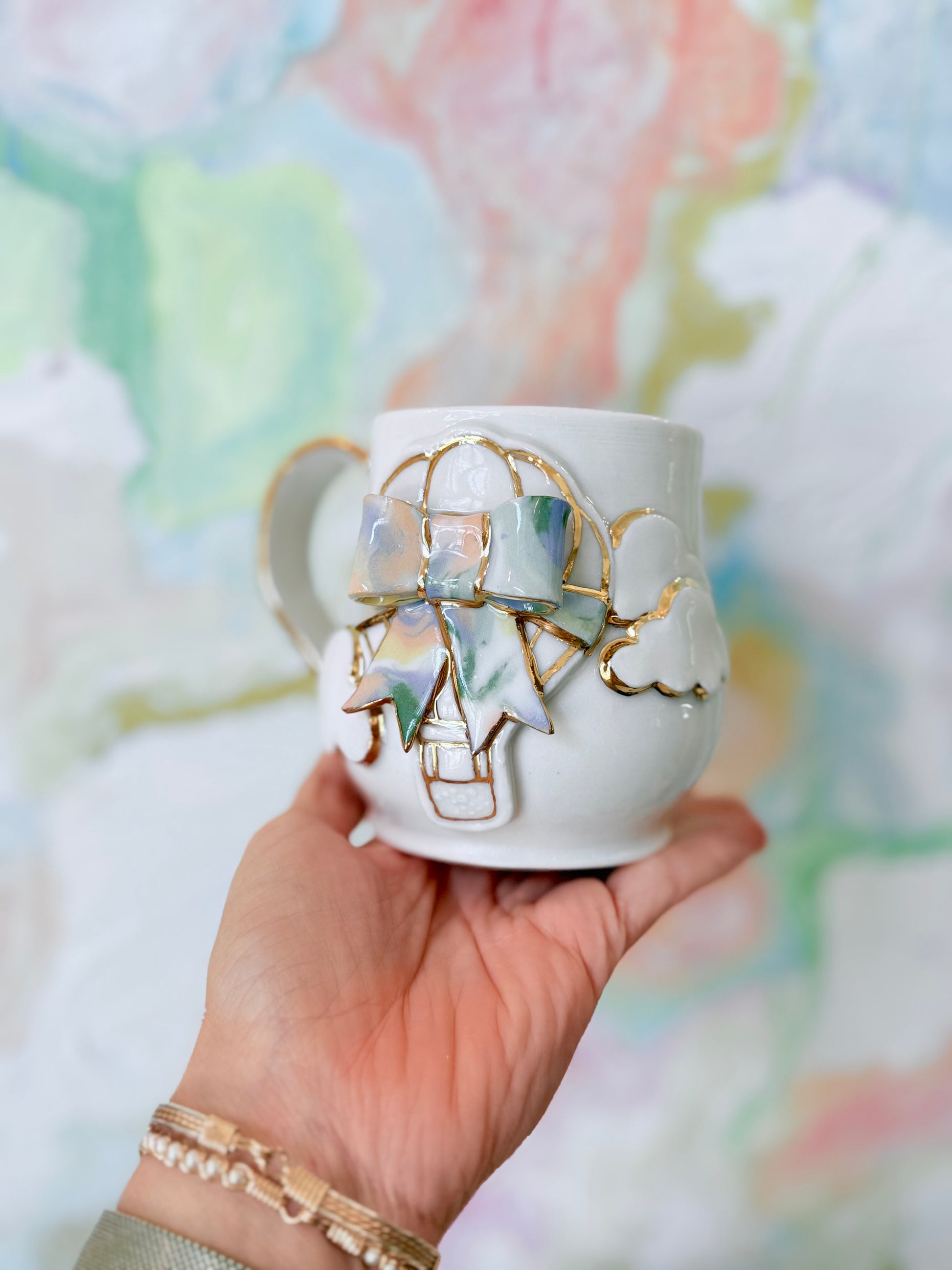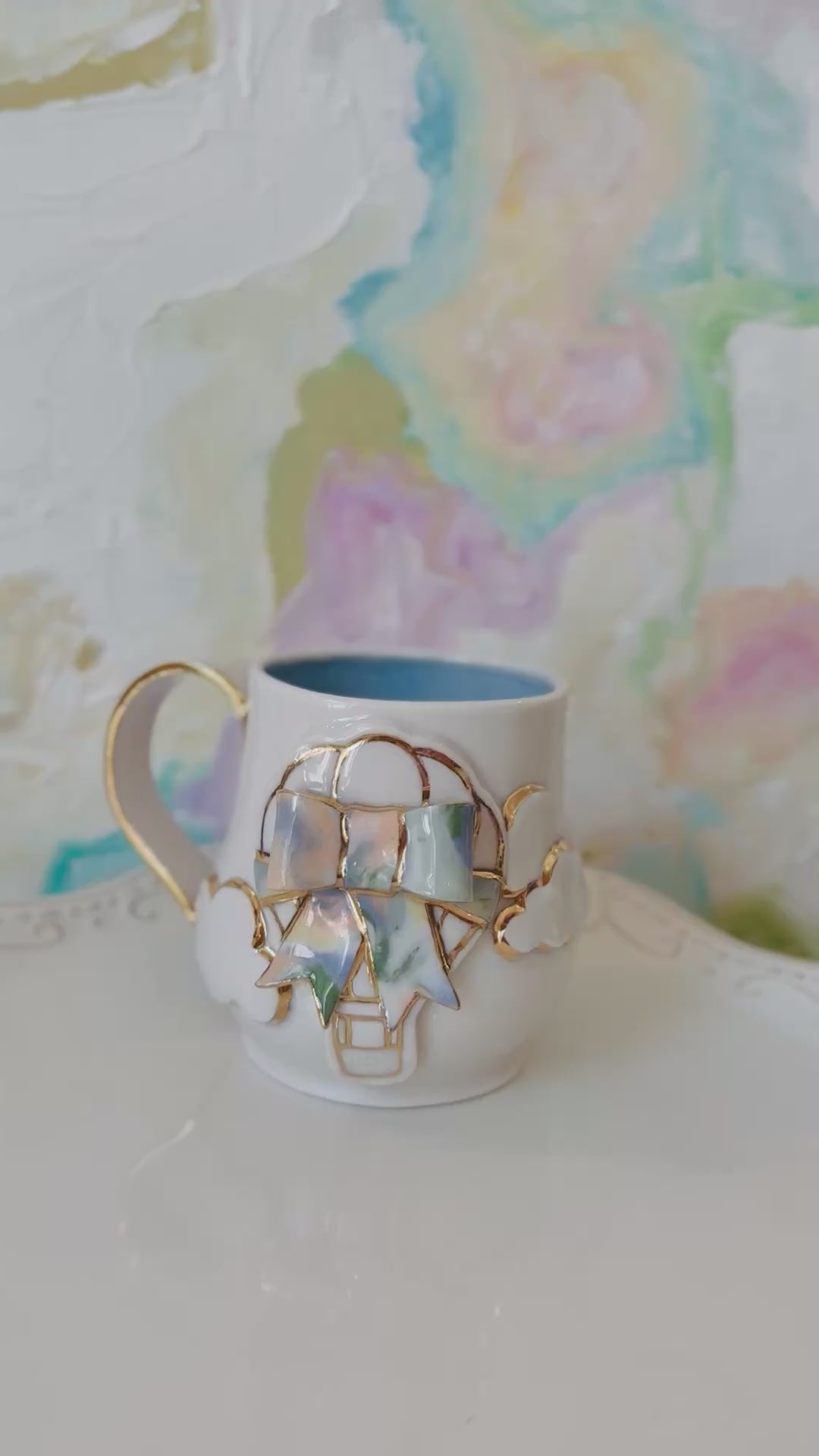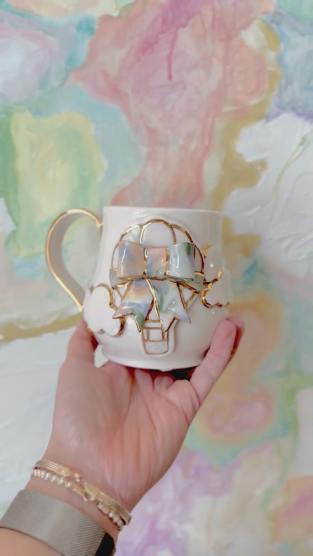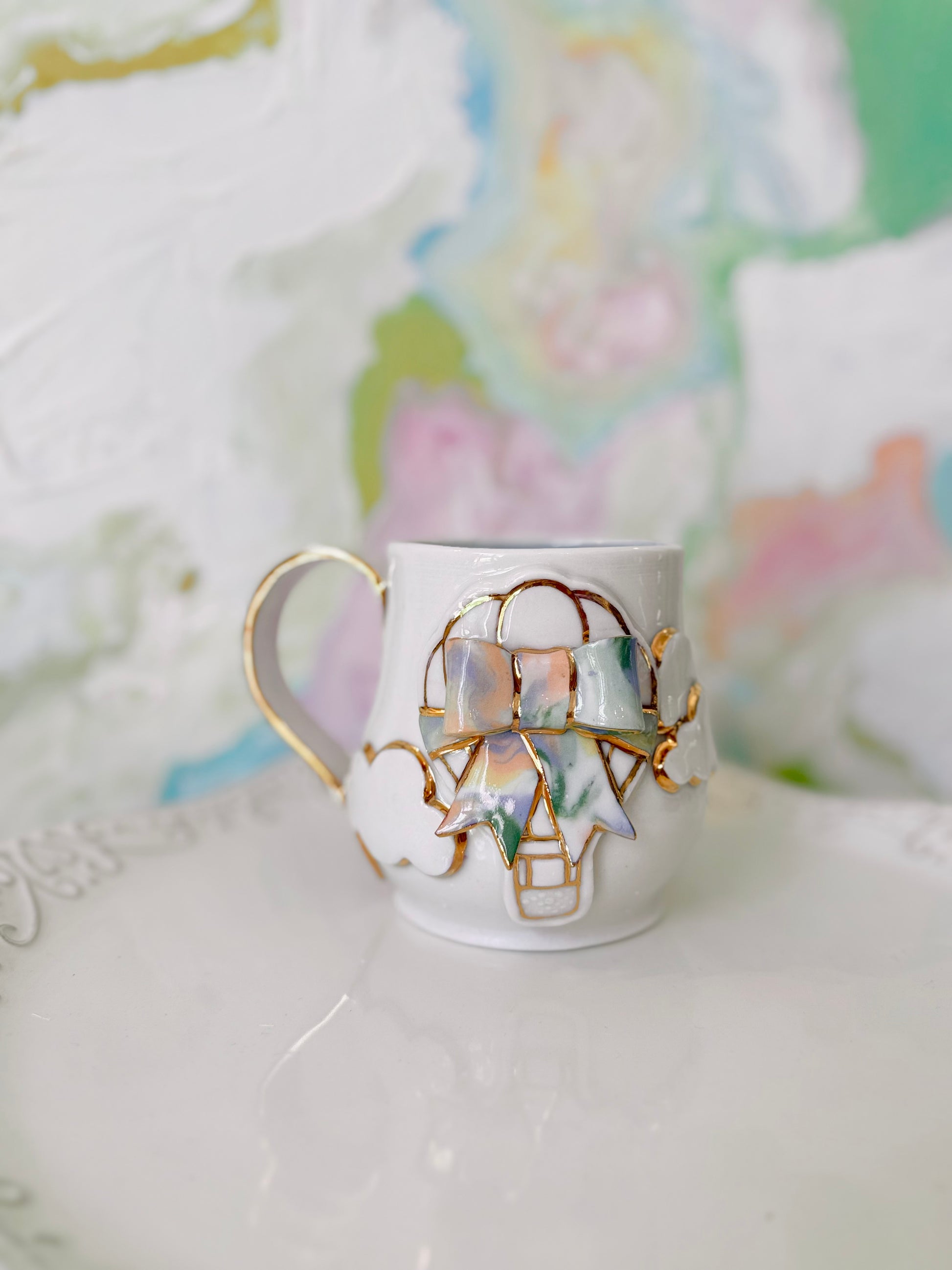 This whimsical handmade porcelain mug features a statement hot air balloon with a bow and clouds with Gleaming Gold accents! Made of crisp white porcelain, this mug excludes elegance! What a joyful way to elevate your daily routine! It’s sure to brighten your day and bring joy to your favorite sips!